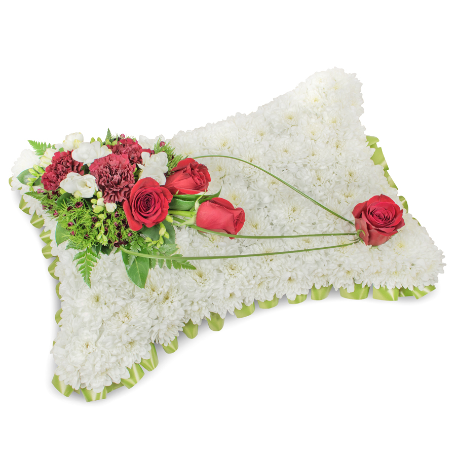 Express your deepest sympathy with our stunning white blossom bouquet, meticulously crafted to convey your heartfelt emotions. This unique arrangement features vibrant white chrysanthemums, passionate red roses, delicate white freesias, rich dark red carnations, elegant dianthus, and graceful bear grass.